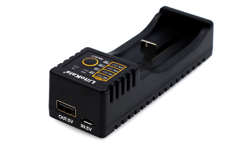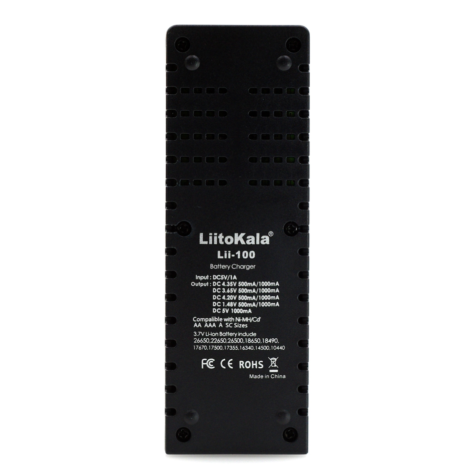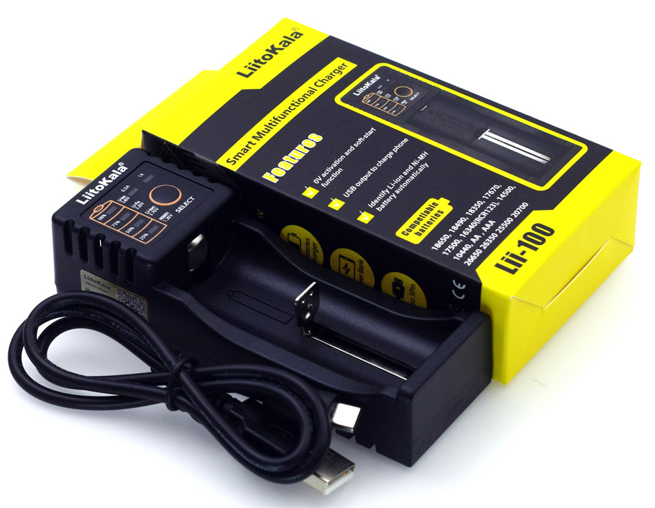 LitoKala Lii-100B je mali i praktičan punjač baterija, dizajniran za punjenje više vrsta baterija, uključujući Li-ion, Li-po, LiHV, LiFePo4, NiMH i NiCd. Punjač automatski detektuje vrstu baterije i LED indikator prikazuje status napunjenosti i brzinu punjenja. Napajanje se obavlja putem Micro USB DC 5V / 1A i ima izlazni napon Li-ion Lipo 4.2V, LiFePo4 3.65V, LiHV 4.35V, 1.55V NiMH NiCd. Struja izlaza je 500mA / 1000mA i uključuje i USB izlazni napon od 5V 1A. Punjač odgovara za veličine baterija: 26650, 21700, 20700, 18650, 18490, 18350, 17670, 17500, 16340 (RCR123), 14500, 10440, AA, AAA.